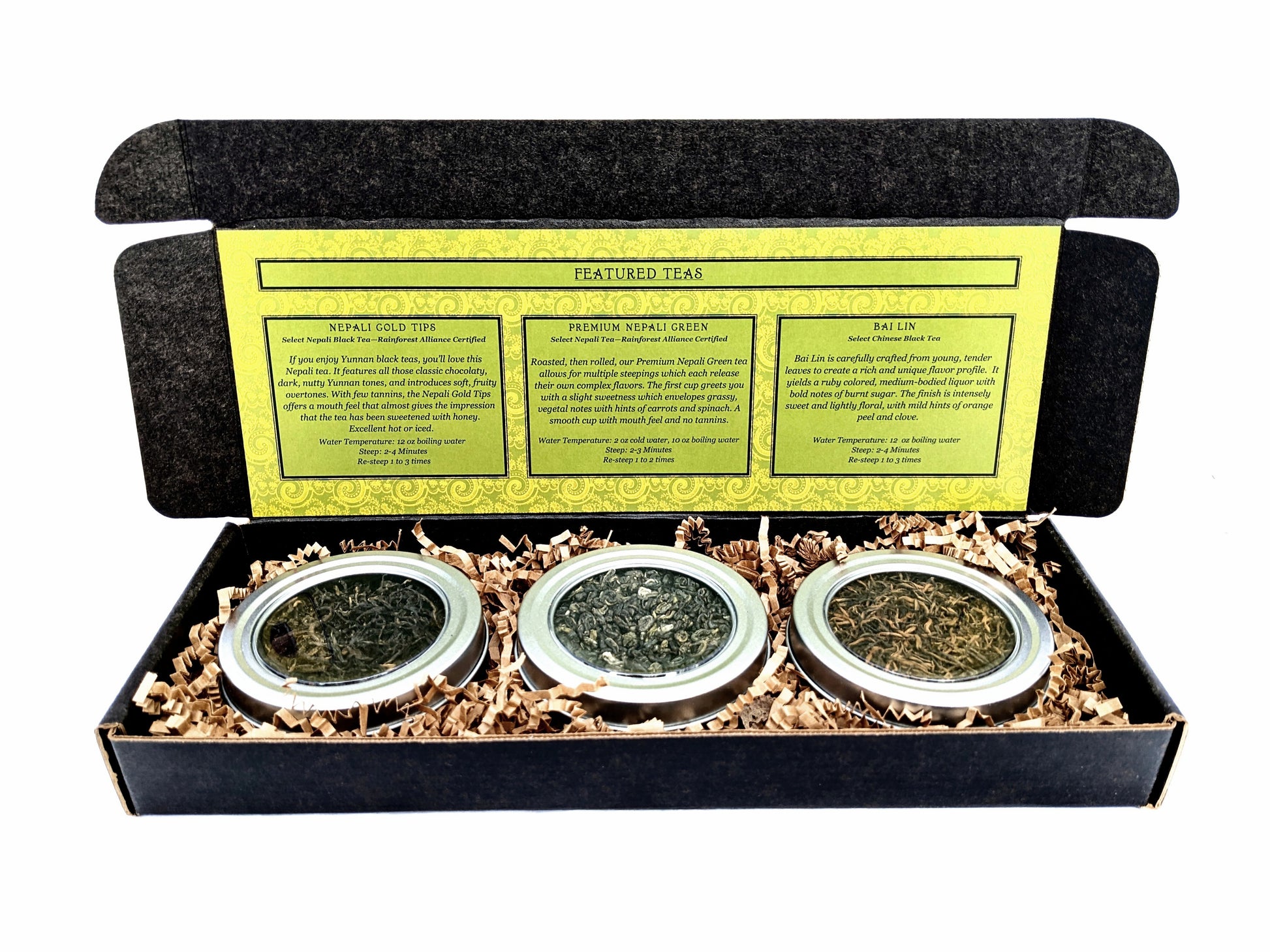 This box includes approximately 1 oz each of Yunnan Pagoda, Guricha, and Taiwan Wild Black with a brief description of each and ideal brewing instructions. An excellent gift for both the experienced tea drinker and the tea novice.